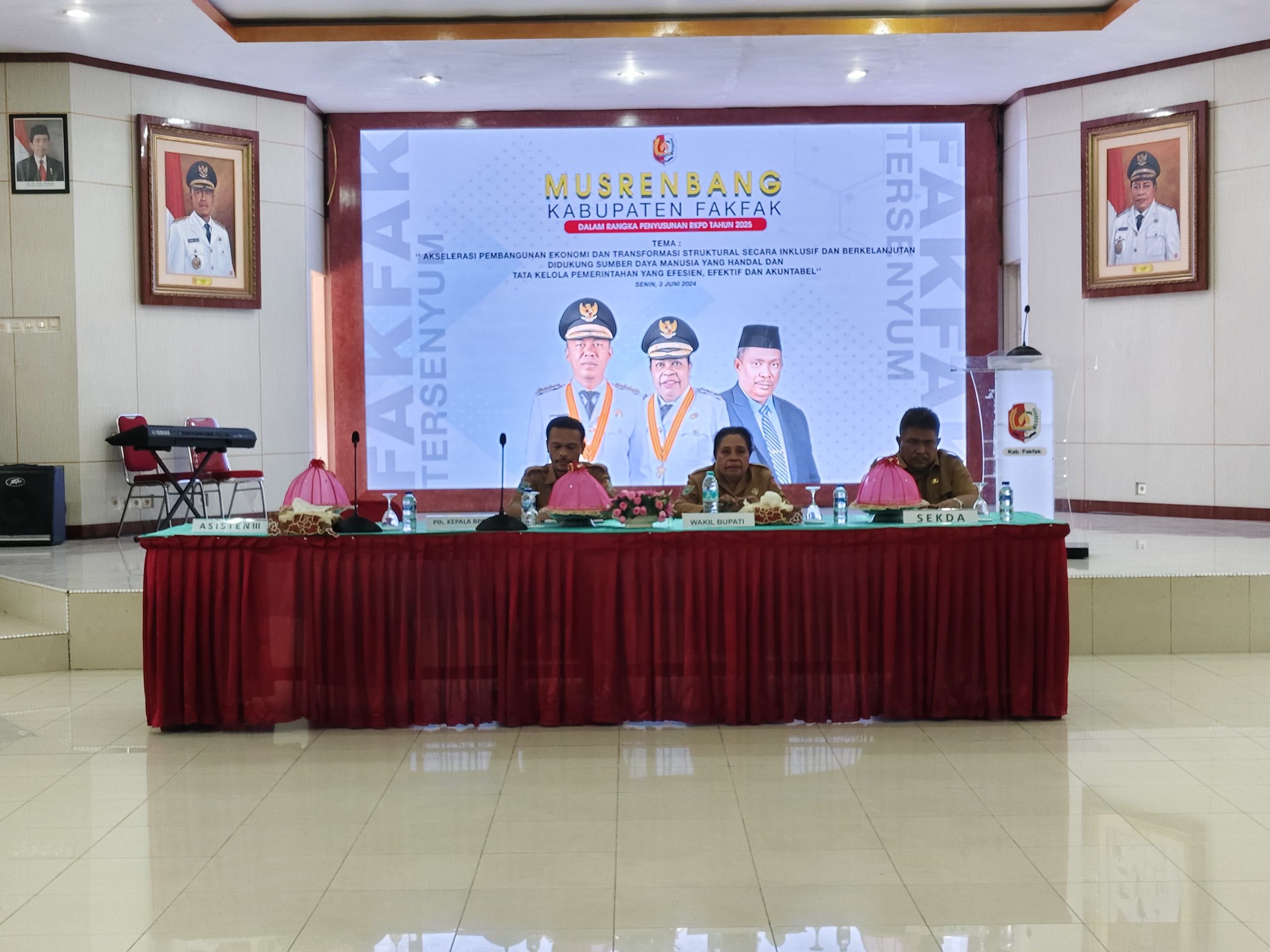 Terlihat, Wakil Bupati Fakfak Yohana Dina Hindom didampingi Pj. Sekertaris Daerah Sulaiman Uswanas dan Plh. Kepala Bappeda & Litbang Awal Woretma pada saat membuka Musrenbang RKPD Tahun 2025.