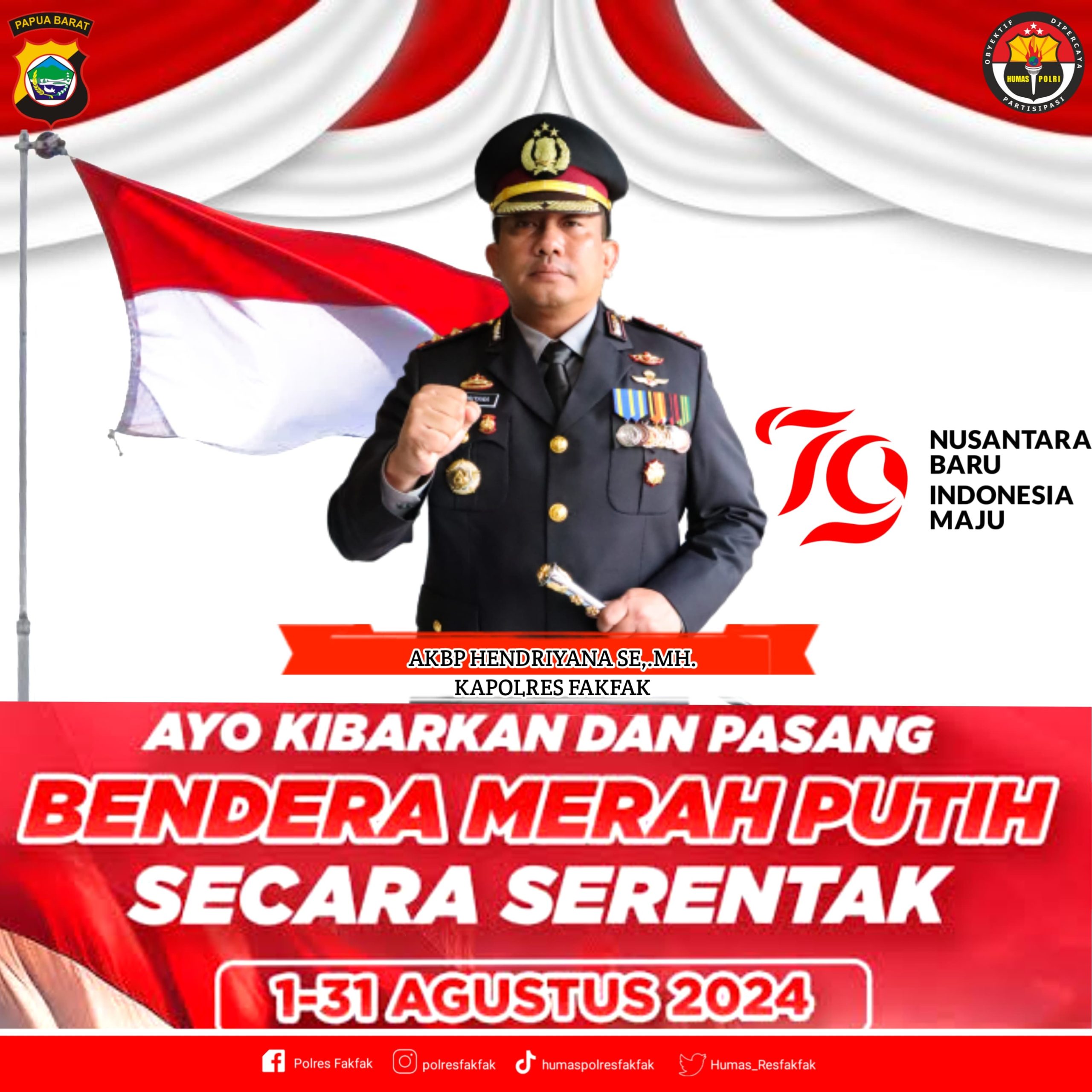 “Kami mengajak seluruh warga dan perkantoran di Kabupaten Fakfak untuk mengibarkan bendera Nasional Merah Putih di depan rumah masing-masing dan di seluruh kantor sebagai tanda penghormatan dan kebanggaan sebagai bangsa Indonesia. Ini adalah momen penting untuk menunjukkan rasa cinta kita kepada Tanah Air,”ujar AKBP Hendriyana.