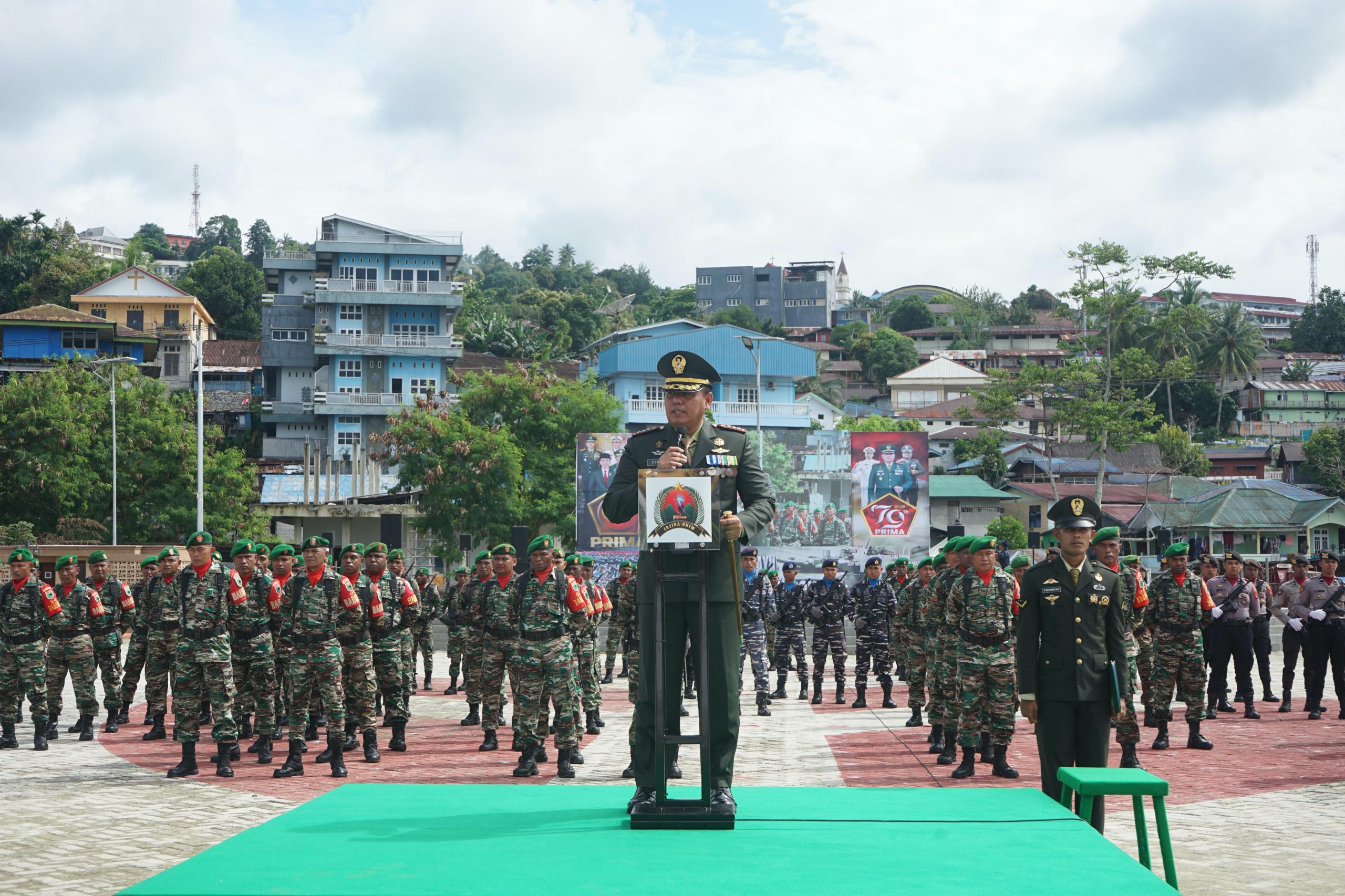 EMBARANMEDIA.COM, FAKFAK – Komandan Korem (Danrem) 182/Jazira Onim, Kolonel Inf Aswin Kartawijaya memimpin Upacara Hari Ulang Tahun (HUT) TNI ke- 79 Tahun, di Taman Ruang Terbuka Hijau (RTH) KH. Ma’ruf Amin Fakfak, Sabtu (5/9/2024).