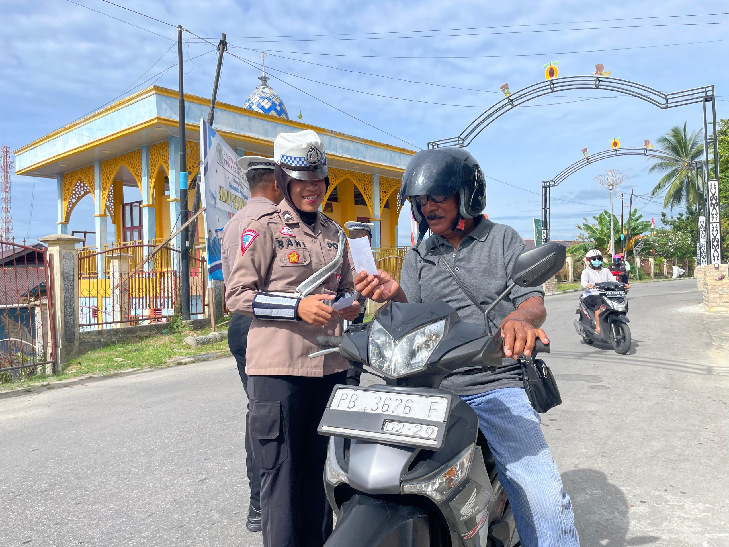 Satlantas Polres Fakfak Bagikan Bingkisan dan Stiker Imbauan kepada Pengguna Jalan