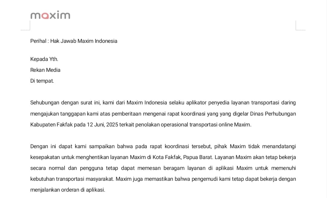 “Layanan Maxim akan tetap beroperasi secara normal. Pengguna tetap dapat memesan beragam layanan Maxim di Kabupaten Fakfak,” demikian kutipan isi surat hak jawab yang diterima awak media di Fakfak, dan berhasil diupdate Wartawan Embaranmedia.com melalui Akun Resmi Facebook Maxim Fakfak, Selasa (17/06/2025) malam.