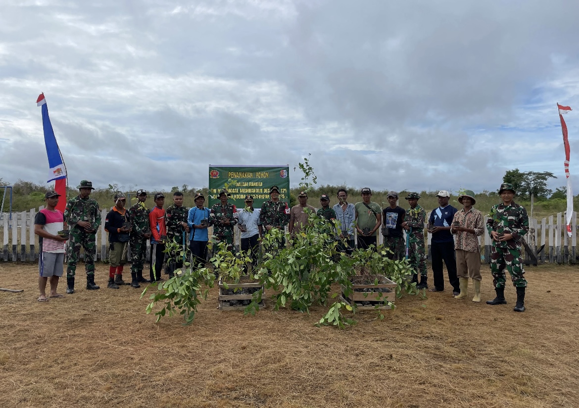 Dengan penuh semangat, anggota Satgas TMMD dan warga bergotong royong menanam berbagai jenis pohon di sekitar perkampungan, mulai dari pohon pelindung seperti matoa dan mahoni hingga pohon buah seperti mangga, yang diharapkan memberi manfaat bagi lingkungan dan kesejahteraan masyarakat.