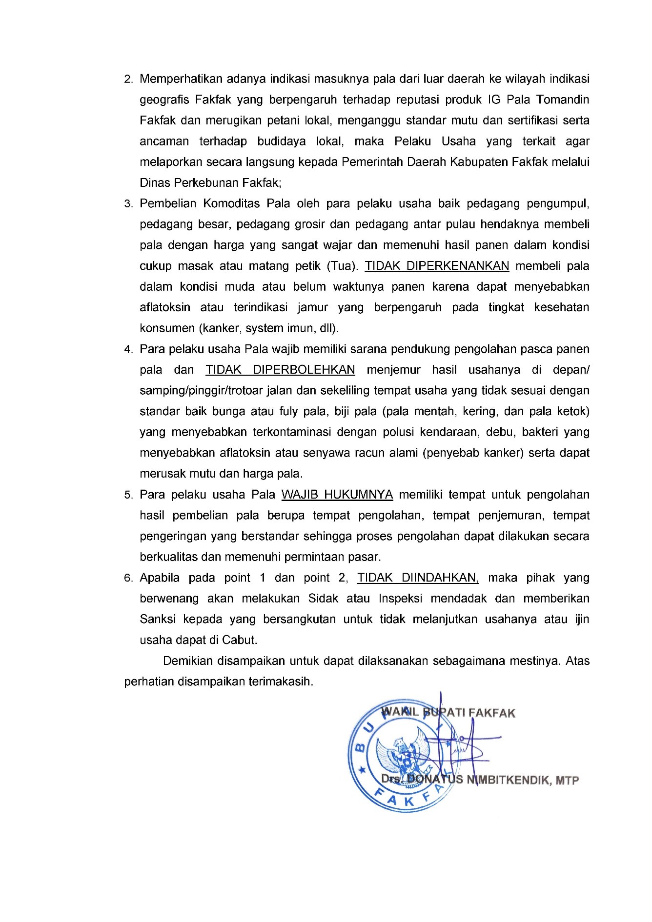 2. Adanya indikasi masuknya pala dari luar daerah ke wilayah IG Fakfak dapat merusak reputasi, standar mutu, sertifikasi, serta mengancam budidaya lokal. Untuk itu, pelaku usaha terkait wajib melaporkan langsung kepada Pemerintah Daerah Kabupaten Fakfak melalui Dinas Perkebunan.