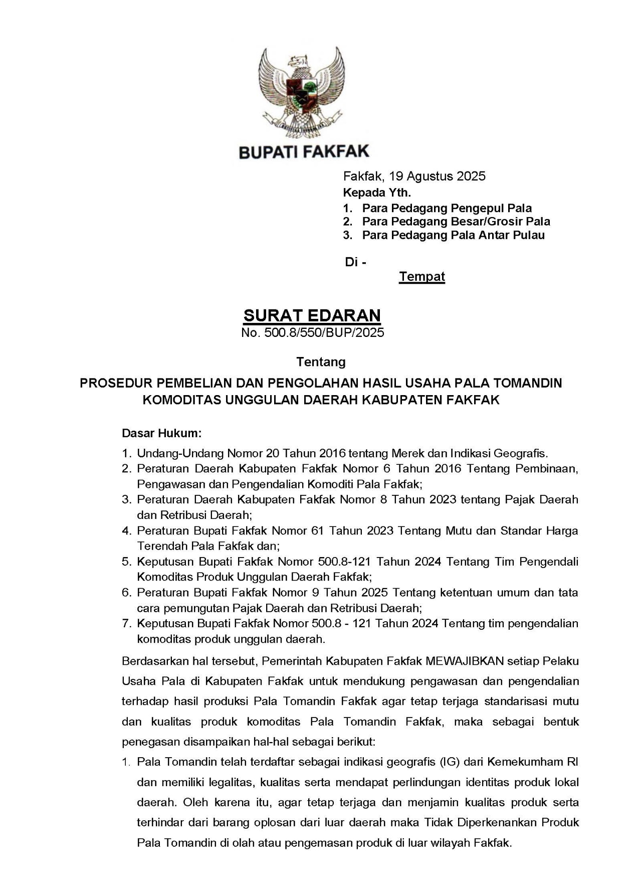 Ini Surat Edaran Prosedur Pembelian dan Pengolahan Hasil Usaha Pala Tomandin Perbesar