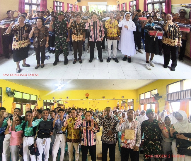 Bupati Fakfak , Samaun Dahlan bagikan seragam gratis secara simbolis di SMA Negeri 2 Fakfak dan SMA Donbosco Fakfak, Kamis, 2/10/2025 (pagi)