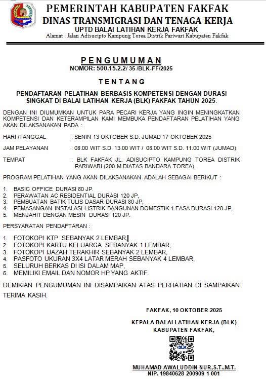BLK Fakfak Buka Pendaftaran Pelatihan Gratis Berbasis Kompetensi Durasi Singkat!! Perbesar