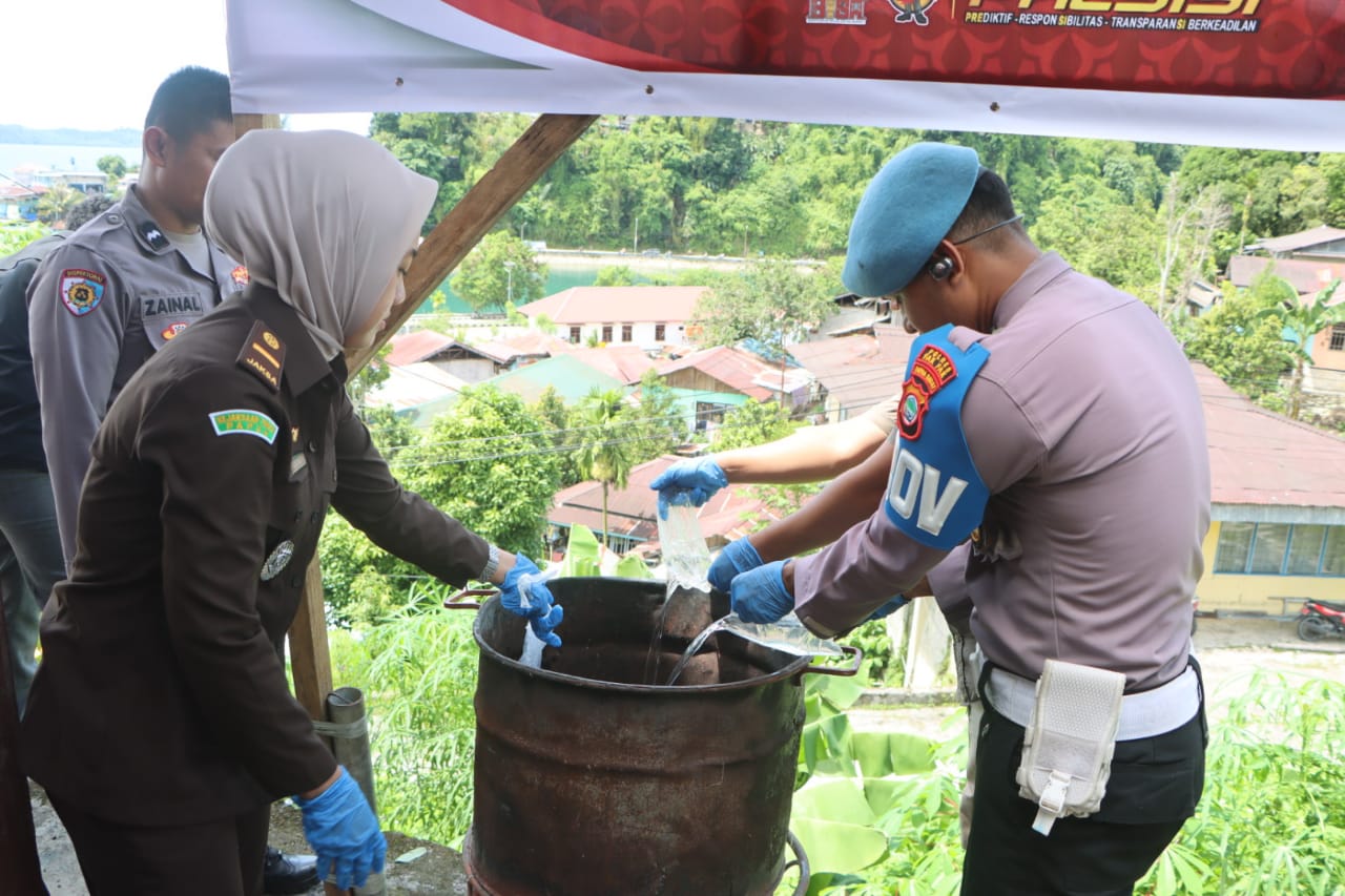 Selanjutnya, dilakukan pemusnahan minuman keras lokal jenis sopi berupa satu jerigen berisi sekitar 30 liter sopi serta bahan baku saguer sebanyak kurang lebih 20 liter. Seluruh barang bukti miras dimusnahkan dengan cara dibuang ke dalam tong khusus.