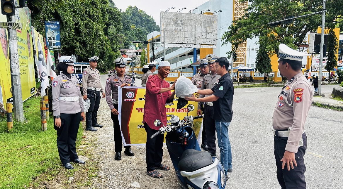 Sebanyak 25 helm standar dibagikan secara gratis kepada pengendara roda dua yang melintas. Pembagian dilakukan secara selektif, dengan prioritas kepada pengendara yang kedapatan tidak menggunakan helm. Petugas tidak hanya menyerahkan helm, tetapi juga menyampaikan imbauan secara humanis mengenai pentingnya keselamatan diri dan keluarga di jalan raya.