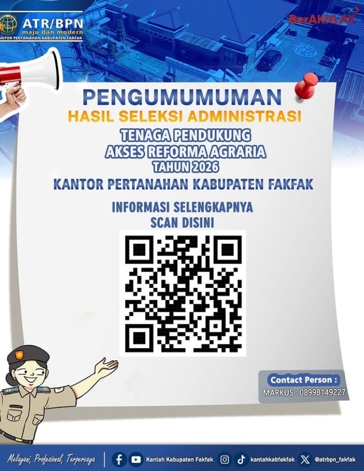 EMBARANMEDIA.COM, FAKFAK – Kantor Pertanahan Kabupaten Fakfak mengumumkan hasil seleksi administrasi Tenaga Pendukung Penanganan Akses Reforma Agraria Tahun 2026. Pengumuman ini ditujukan kepada seluruh pelamar yang telah mengikuti proses pendaftaran dan seleksi berkas beberapa waktu lalu.