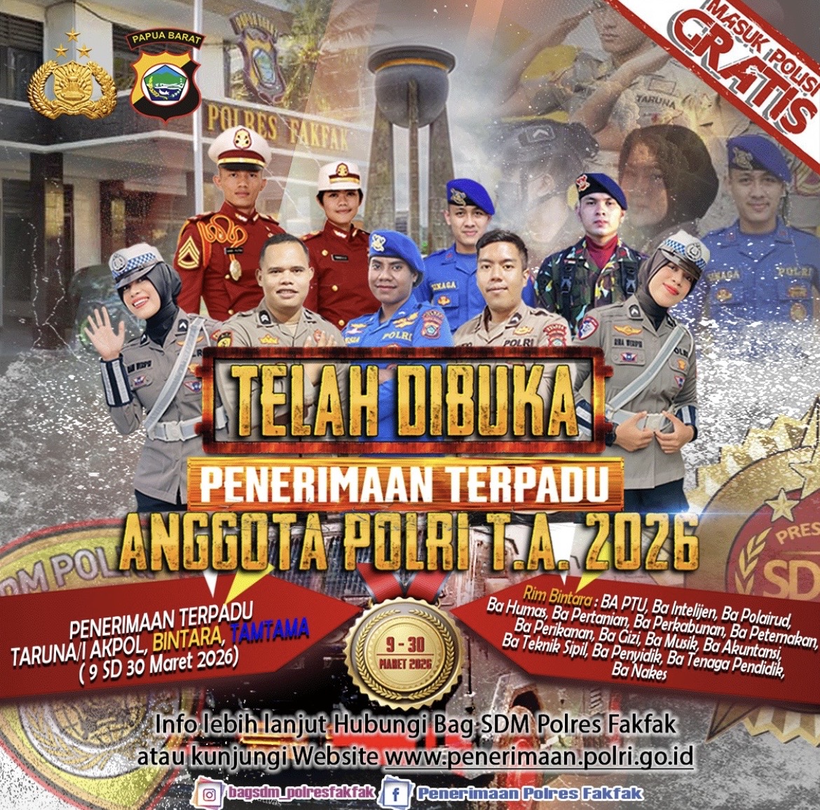 EMBARANMEDIA.COM, FAKFAK – Kepolisian Negara Republik Indonesia secara resmi membuka Penerimaan Terpadu Anggota Polri Tahun Anggaran 2026. Momentum ini menjadi peluang bagi generasi muda Indonesia, khususnya putra–putri terbaik Papua Barat di Kabupaten Fakfak, untuk mengabdikan diri sebagai Bhayangkara Negara. Selasa (10/03/2026)