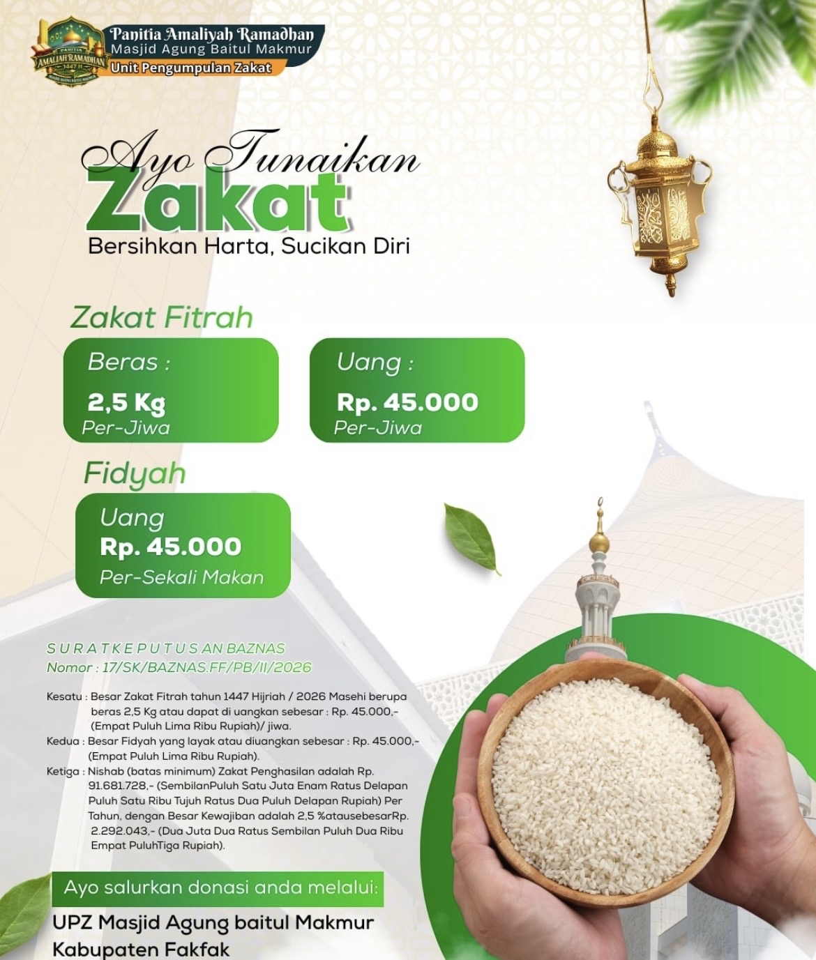 EMBARANMEDIA.COM, FAKFAK – Dalam rangka memudahkan masyarakat menunaikan kewajiban zakat di bulan suci Ramadhan, Unit Pengumpul Zakat (UPZ) Masjid Agung Baitul Makmur Fakfak resmi membuka posko layanan zakat dari 20 Ramadhan 1447 Hijriah.