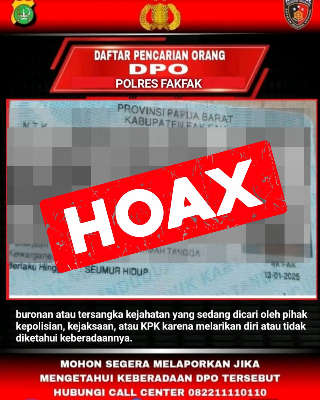 EMBARANMEDIA.COM, FAKFAK – Terkait beredarnya informasi di media sosial mengenai Daftar Pencarian Orang (DPO) kasus narkotika jenis sabu-sabu di wilayah Wagom, Distrik Pariwari, dengan ini disampaikan bahwa informasi tersebut adalah tidak benar (HOAX). Senin (6/4/2026).