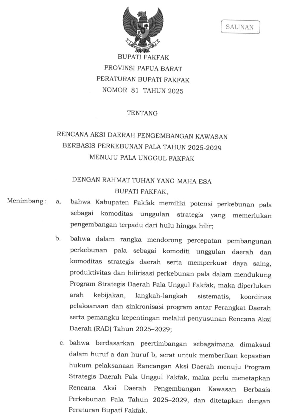 EMBARANMEDIA.COM, FAKFAK — Pemerintah Kabupaten Fakfak resmi menetapkan Peraturan Bupati (Perbup) Nomor 81 Tahun 2025 tentang Rencana Aksi Daerah (RAD) Pengembangan Kawasan Berbasis Perkebunan Pala Tahun 2025–2029. Kebijakan ini merupakan turunan strategis dari Peraturan Daerah Nomor 8 Tahun 2025 tentang RPJMD Kabupaten Fakfak 2025–2029 dalam mendukung visi Fakfak Membara.