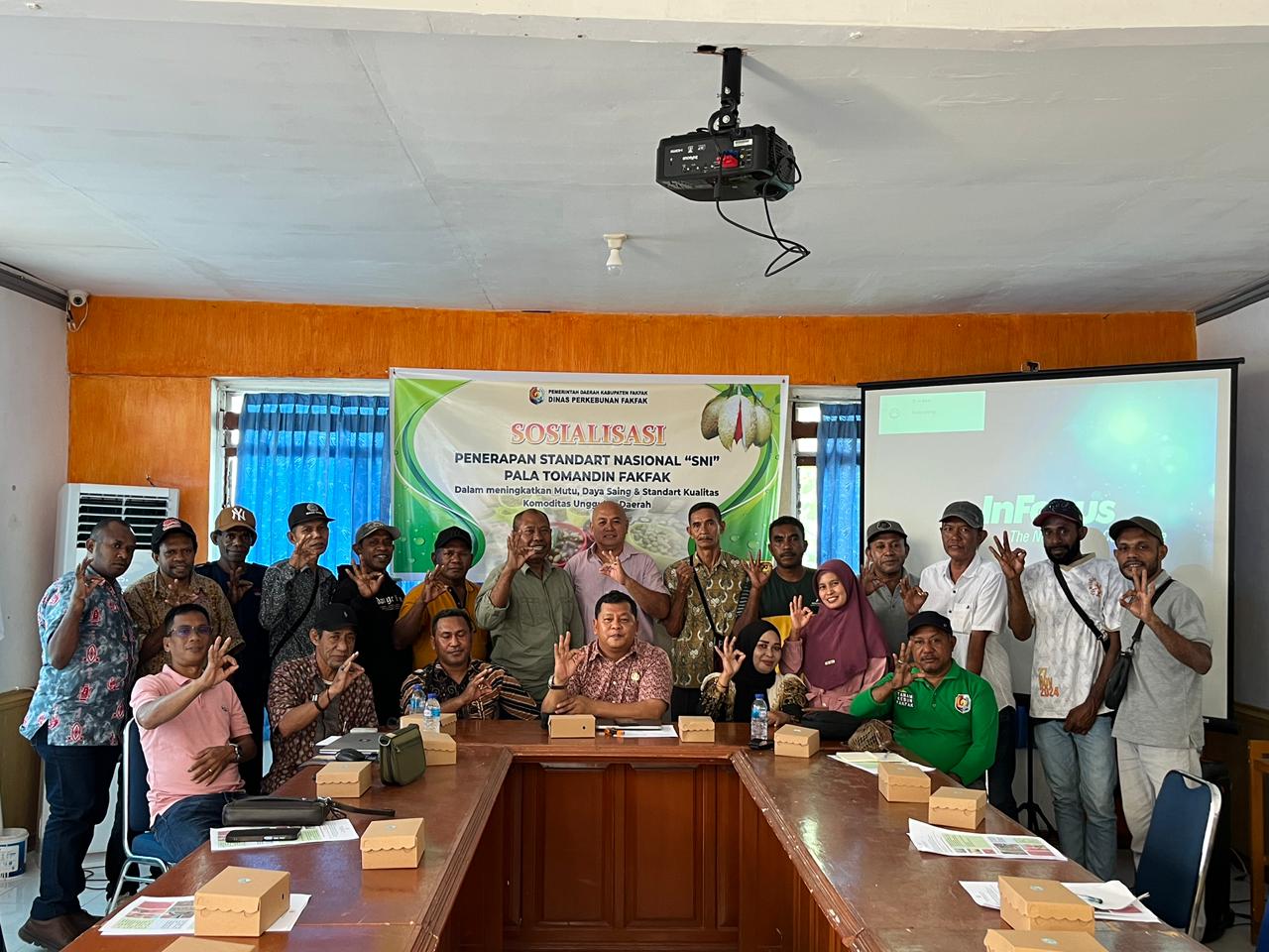 Kegiatan sosialisasi tersebut berlangsung di Kantor Dinas Perkebunan Kabupaten Fakfak dan dibuka oleh Kepala Dinas Perkebunan Fakfak yang mewakili Bupati Fakfak. Kegiatan ini diikuti oleh 45 peserta yang terdiri dari perwakilan petani pekebun pala, kelompok tani, pelaku pengumpul dan pengepul pala, serta masyarakat Perlindungan Indikasi Geografis Pala Tomandin Fakfak yang menjadi bagian penting dalam rantai produksi dan perdagangan pala di daerah tersebut.