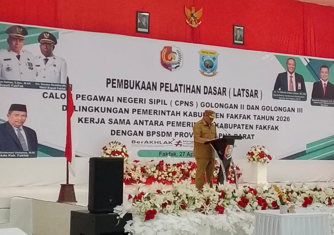 EMBARANMEDIA.COM, FAKFAK – Bupati Fakfak, Samaun Dahlan, menekankan pentingnya kedisiplinan, tanggung jawab, dan integritas kepada seluruh peserta Pelatihan Dasar (Latsar) CPNS Tahun 2026.
