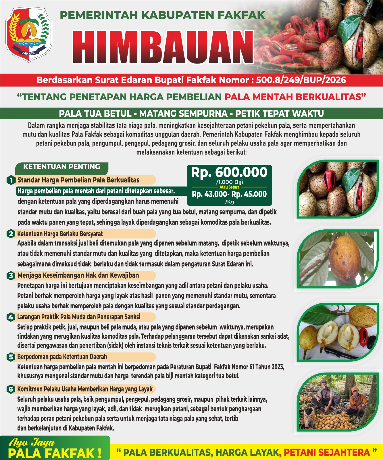 EMBARANMEDIA.COM, FAKFAK – Pemerintah Kabupaten Fakfak terus menggencarkan langkah strategis dalam menata tata niaga komoditas pala sebagai unggulan daerah. Salah satunya melalui sosialisasi masif Surat Edaran Bupati Fakfak Nomor 500.8/249/BUP/2026 tentang penetapan harga pembelian pala mentah berkualitas.